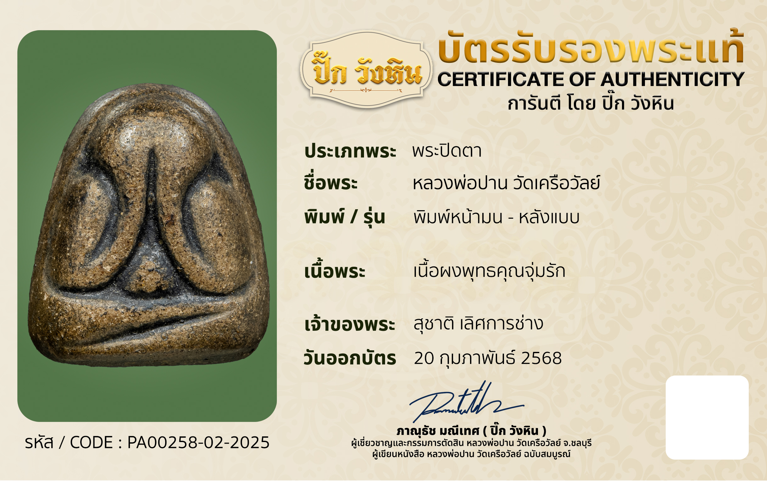 รหัสบัตรรับประกัน : PA00258-02-2025