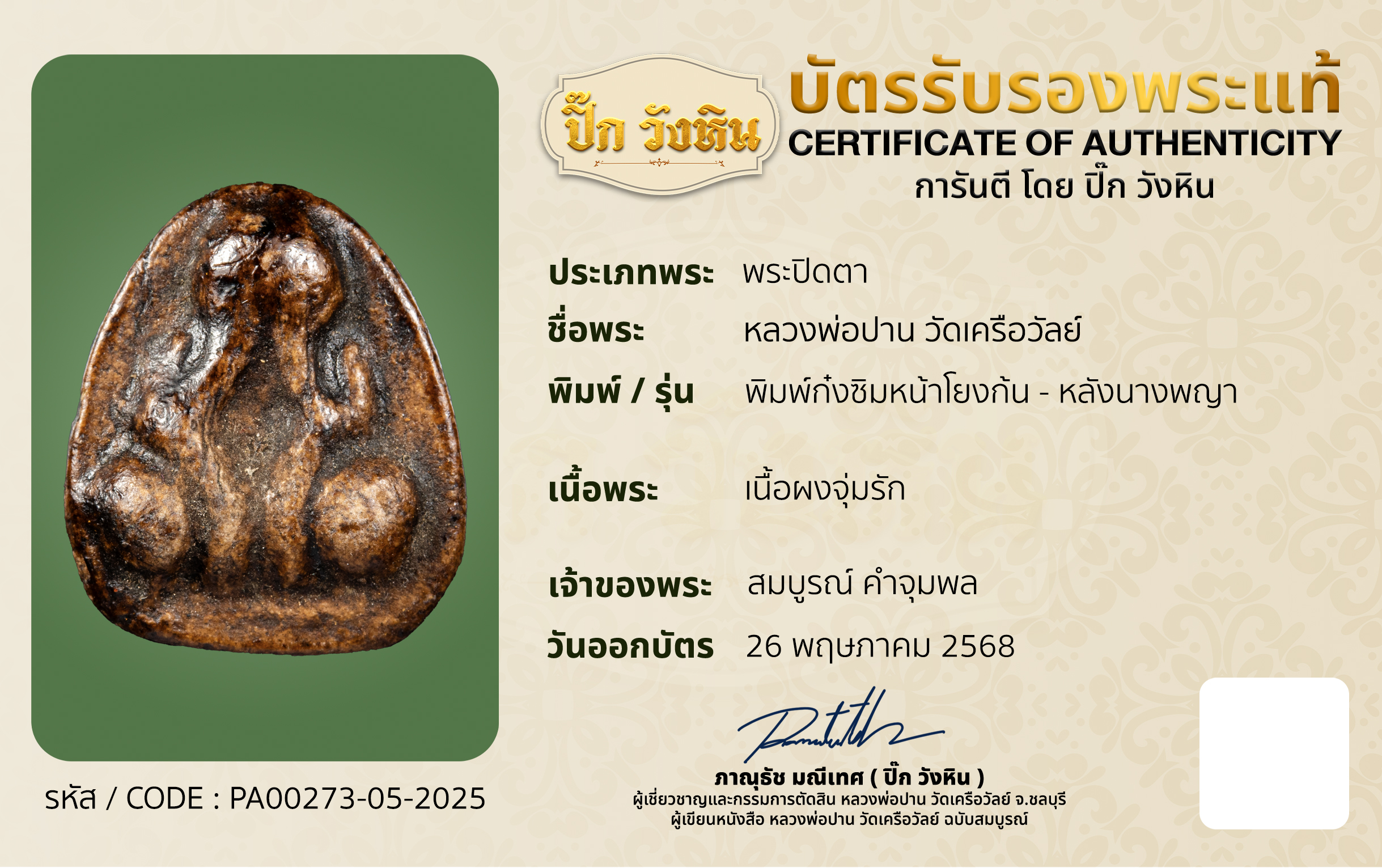 รหัสบัตรรับประกัน : PA00273-05-2025